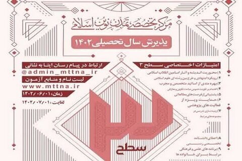این مؤسسه همچنین در رشته «فرهنگ، هنر و تمدن اسلامی» با اعطای رسمی مدرک «سطح ۲» اقدام به پذیرش طلبه کرده است و علاقهمندان برای کسب اطلاعات بیشتر در این باره هم میتوانند به نشانی؛ Mttna_ir@ و برای ثبت نام به آدرس www.mttna.ir مراجعه کنند.
