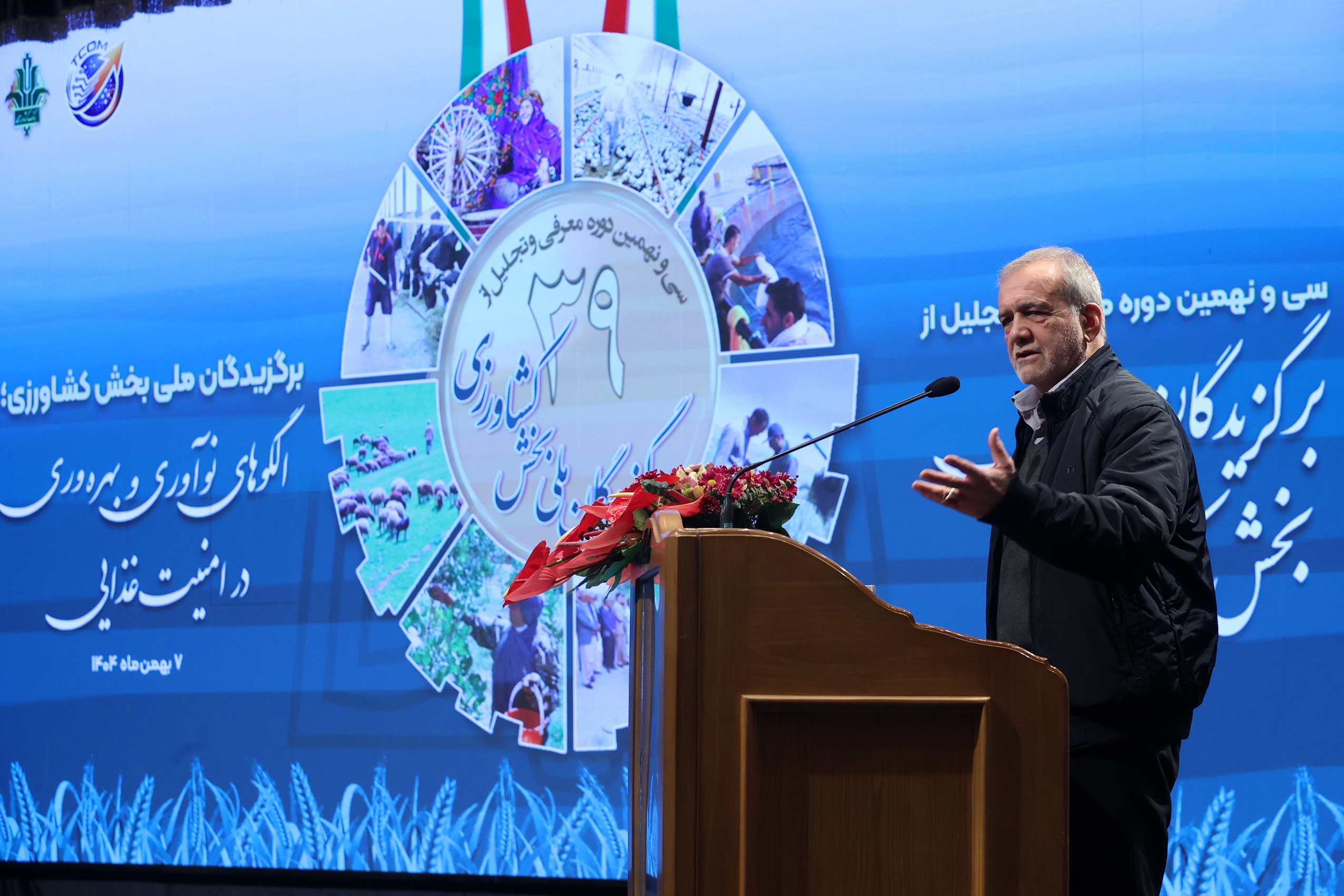 به گزارش خبرگزاری صدا و سیما، مسعود پزشکیان صبح امروز سه‌شنبه ۷ بهمن ۱۴۰۴ در آئین سی و نهمین دوره معرفی و تجلیل از برگزیدگان ملی بخش کشاورزی، در سخنانی بر نقش مهم تلاش جمعی در ساختن آینده‌ای بهتر برای کشور و نسل‌های آینده تأکید کرد: قطعا با همت و تلاش شما، آینده‌ای شکوهمندتر و روشن‌تر برای این کشور، مردم‌مان و آیندگان رقم خواهیم زد.
